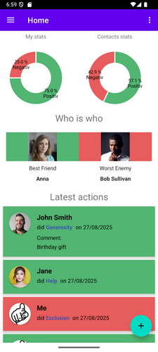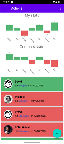 - Log Your Actions: The app lets you log both "good" and "bad" actions, either for yourself ("me") or for your contacts.